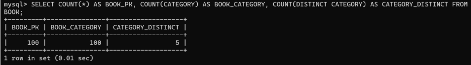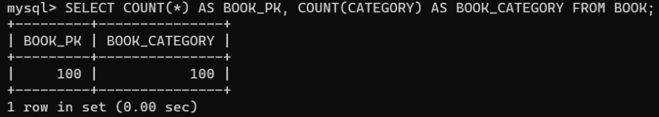책 리스트가 100권 있으므로 카테고리의 종류는 5가지 이지만 각 책 한권마다 카테고리를 가지기 때문에 카테고리를 가진 책의 개수가 100 권 있다.