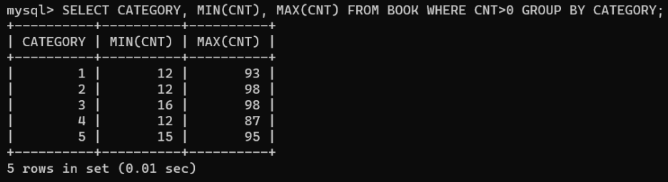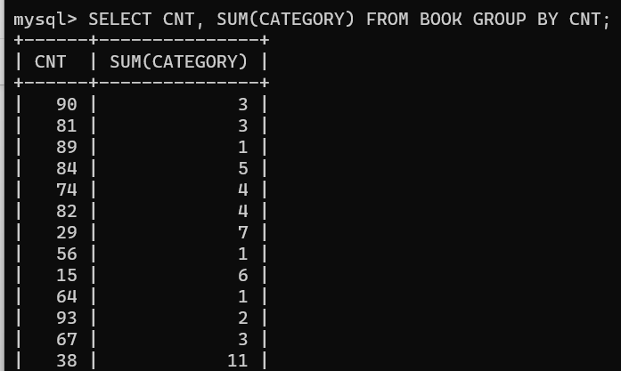 CNT와 CATEGORY 를 그룹화 하여 CNT와 CATEGORY 둘다 작은 순 부터 개수를 계산하여 정렬 하였다.