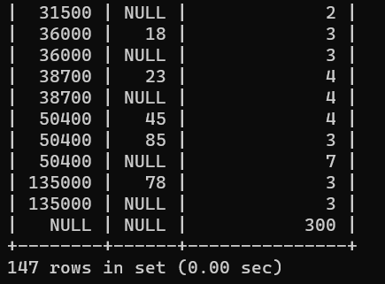 그리고 PRICE, CNT 모두 NULL 인 곳은 총합이다. 만약 PRICE열에 중간합이나 총합이 필요하면 쿼리에서 CNT 열을 제외해야 한다.