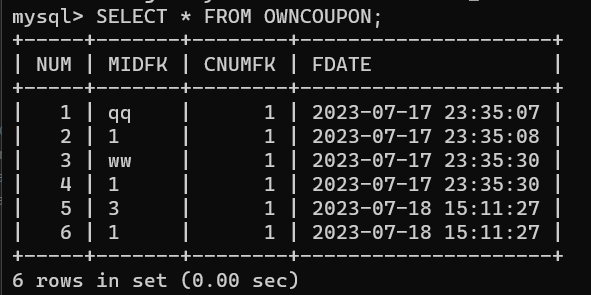 OWNCOUPON 의 원래 테이블과 비교 했을때 NUM 순차적으로 나왔고 MIDFK가 1인 애들만 비교해서 나왔다.