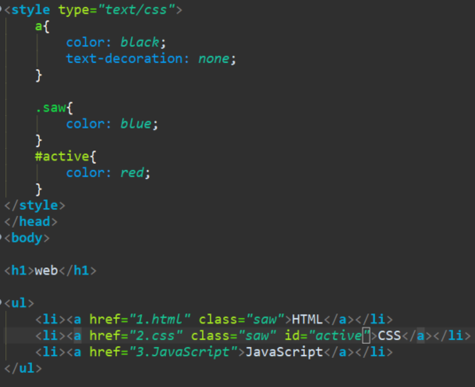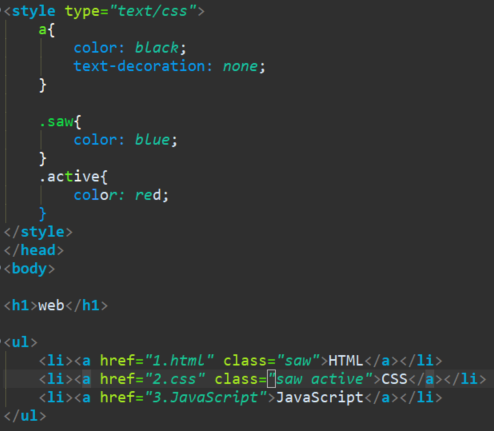 다음으로 'css' 링크, 즉 현재 머물고 있는 페이지의 링크를 빨간색으로 표시 하고 싶다면 active라는 클래스를 추가하고, active 선택자에 폰트 색상을 빨간색으로 지정하면 된다.