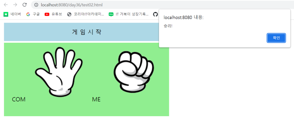 alert('승리!'); // 0번이 주먹이고 2번이 가위라 주먹과 가위 인데 내가 이겼다고 나온다 ,,,