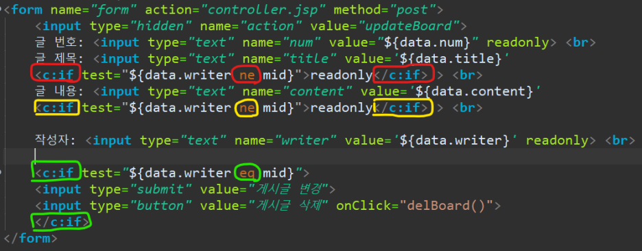- 초록색 : 만약 (글 작성자)와 (내 회원 아이디)랑 일치한다면 ? 숨겨졌던 "submit" 게시글 변경 과 "button" 게시글 삭제 둘 다 보이게 만들어줘