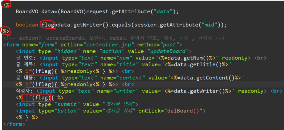 if(flag) 자체가 if ( data.getWriter().equals(session.getAttribute("mid")) ) 이다. 서로 같다.