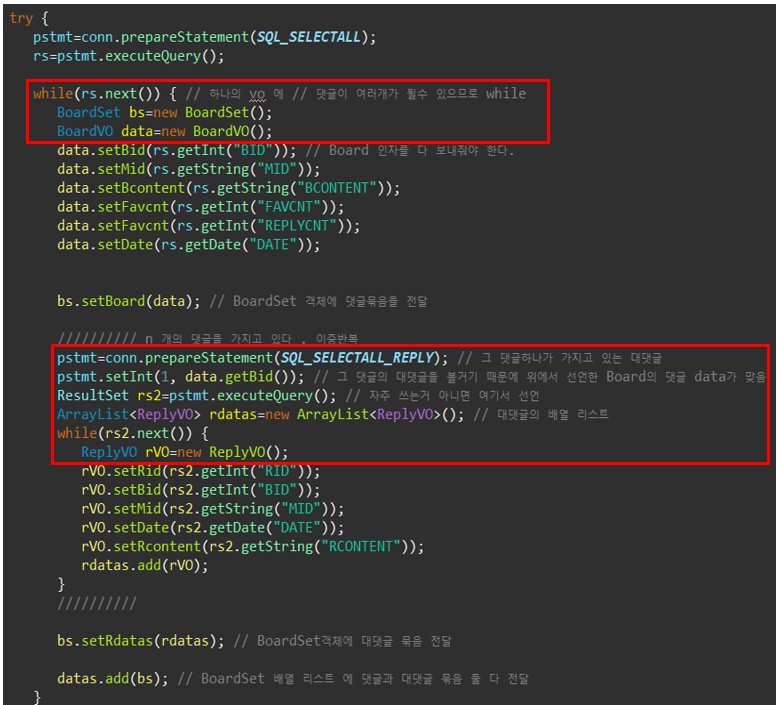 현재 보드셋 1:N 자리 받고 싶어 -> 여러개 받아서 -> 반환보내주는중 -> 보드셋 하나에 리플라이 여러개 만들어야함 -> BoardSet 하나에 Reply 여러개 (while) -> pstmt=conn.preparestatement(sql_selectall) 하는걸로 꺼내줌 -> 위에 selectAll 이름 같으니까 _REPLY 붙여주고