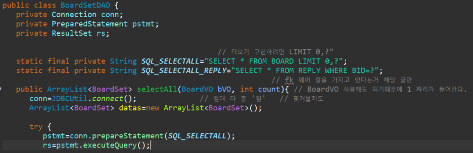 ★ public ArrayList<BoardSet> selectAll(BoardVO bVO,int count) -> count를 VO안에 넣을수 있으면 넣는게 좋다 -> 빠져나와있으면 유지보수에 불리하다.