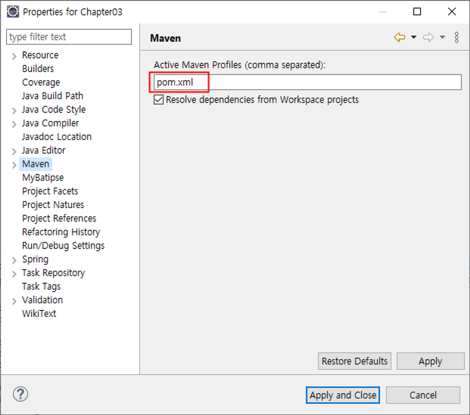 Project > Properties -> Maven에서