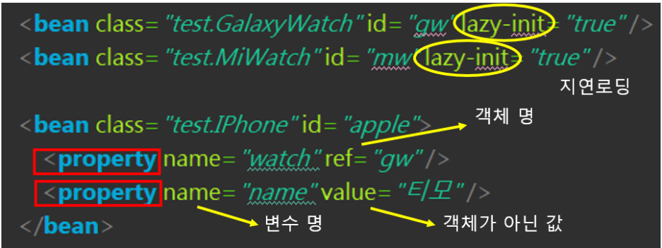 - <bean class="test.IPhone" id="apple"> : 기본 생성자 이다.