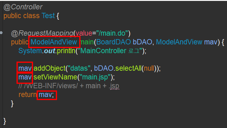 가지고 갈 데이터가 없다면 redirect 를 붙여준다. "redirect:main.jsp" 라고 사용해야 한다.