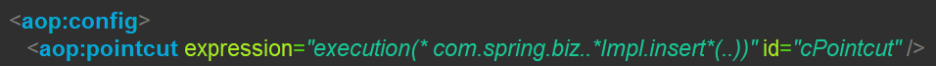<aop:pointcut expression="execution(* com.spring.biz..*Impl.insert*(..))" id="cPointcut" />