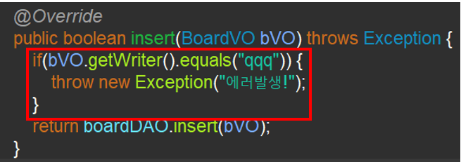 6. BoardServiceImpl 에서 조건문으로 해당 아이디("qqq")가 작성하려고 하면 에러를 발생