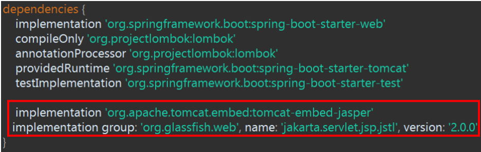 - implementation 'org.apache.tomcat.embed:tomcat-embed-jasper'