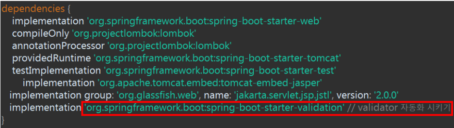implementation 'org.springframework.boot:spring-boot-starter-validation' // validator 자동화 시키기