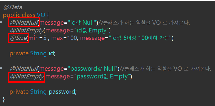 @Valid 는 검증 할려는 객체가 무엇인지 정해준다. 지금은 VO 객체 이기 때문에 VO 앞에 붙인다.