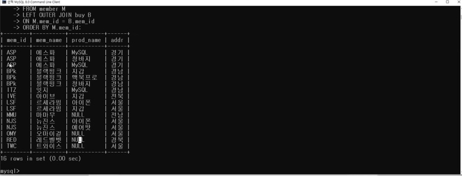 <LEFT | RIGHT | FULL> [OUTER] JOIN <두 번째 테이블(RIGHT)>